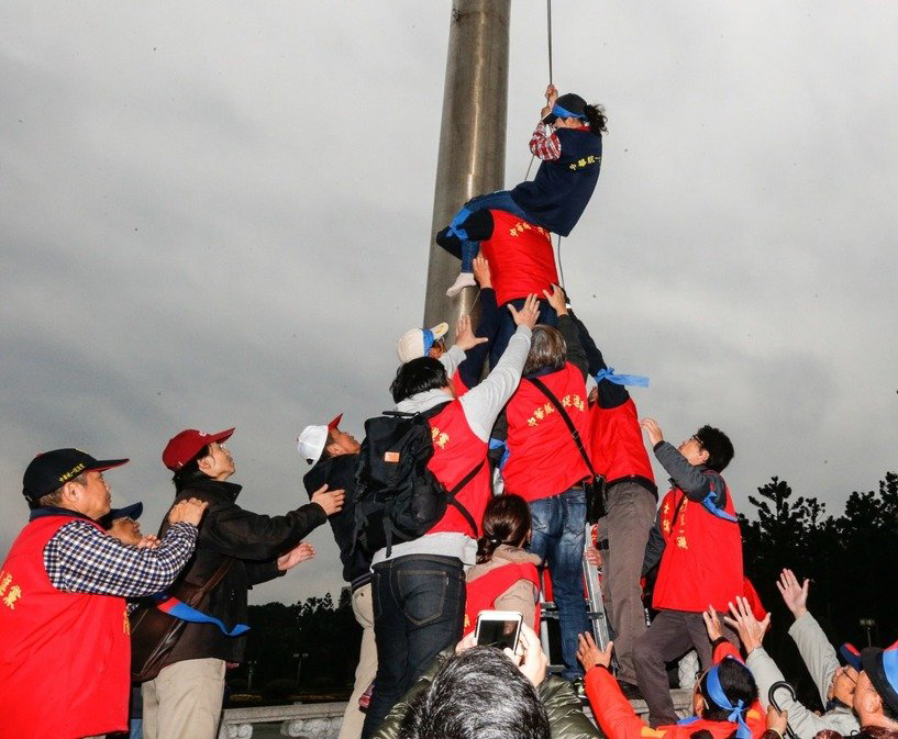 島內(nèi)的中國(guó)統(tǒng)一促進(jìn)黨支持者,將中正紀(jì)念堂前廣場(chǎng)上的“半旗”升起。館方派人將旗再次降下,統(tǒng)一黨支持者再次拿梯子爬上去將旗升上。(圖片來(lái)源:臺(tái)灣聯(lián)合新聞網(wǎng))