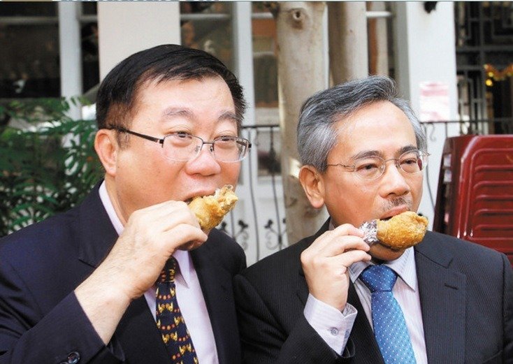 陳;(左)和邱文達(dá)(右)擔(dān)任臺(tái)“農(nóng)委會(huì)主委”、“衛(wèi)生署署長”時(shí),也曾公開大啃雞肉,來證明安全。(臺(tái)灣《聯(lián)合》報(bào)系資料圖)