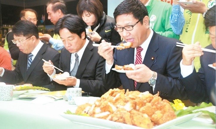 臺(tái)南市長賴清德(左2)公開場合吃雞肉證明安全。(臺(tái)灣《聯(lián)合》報(bào)系資料圖)