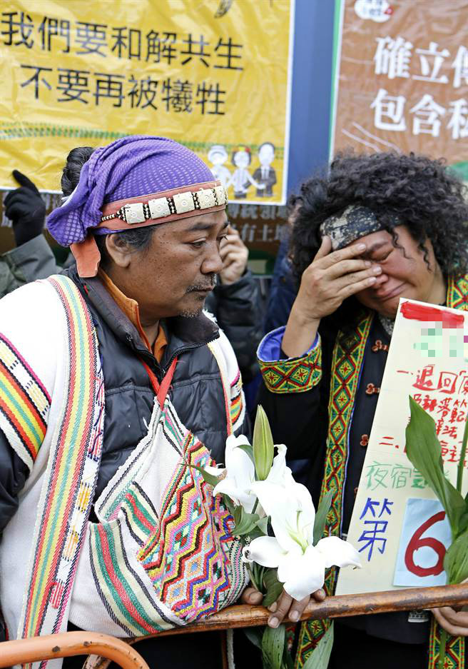 2月28日,臺少數(shù)民族歌手那布(左)與巴奈(右)夫婦等人在凱道召開“二二八轉(zhuǎn)型正義 蔡英文歸還傳統(tǒng)領(lǐng)域,不要再騙!”記者會,說到激動處,巴奈不禁流淚。(圖片來源:臺“中時電子報”)