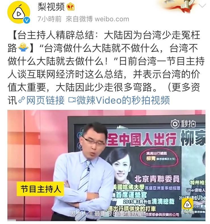 一些媒體報(bào)道說(shuō),該臺(tái)灣節(jié)目主持人在談到互聯(lián)網(wǎng)經(jīng)濟(jì)時(shí),認(rèn)為臺(tái)灣的價(jià)值太重要,“大陸因?yàn)榕_(tái)灣少走了很多冤枉路!