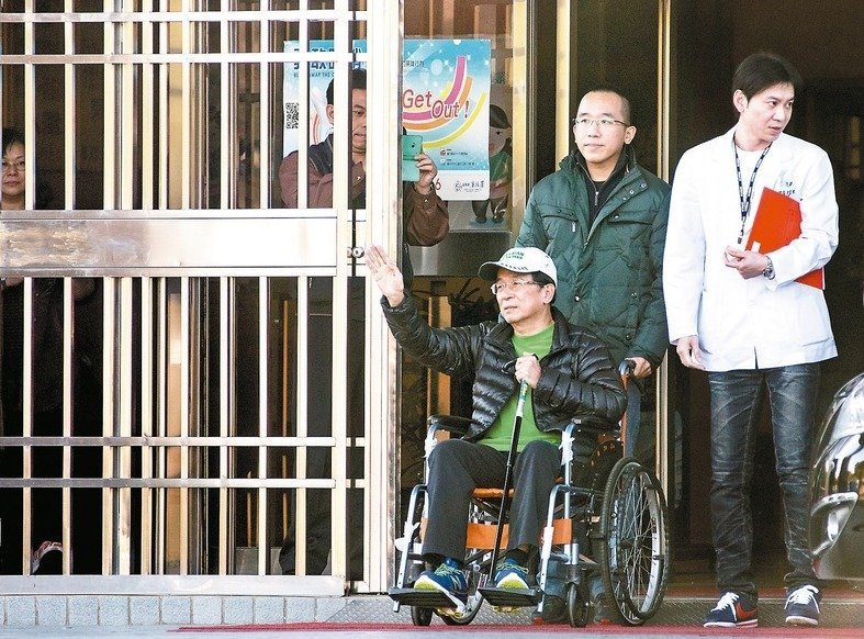 陳水扁保外就醫(yī),由兒子陳致中推著輪椅出監(jiān)。(圖片來源:臺灣《聯(lián)合報》)