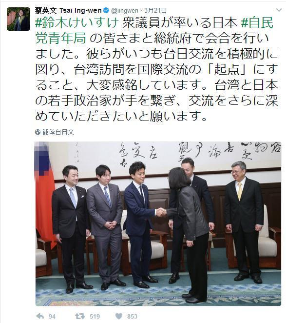 報(bào)道稱,這是蔡英文針對與3月18-20日訪問臺灣的日本自民黨青年局長鈴木馨祐進(jìn)行的會(huì)談而發(fā)布的推文。不過,大陸政府對其頻繁的“日語推特”繃緊了神經(jīng)。日媒報(bào)道稱,中國外交部相關(guān)人士認(rèn)為蔡英文的“目的是在中日關(guān)系間打楔子”。