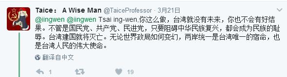 網(wǎng)友@Taice說:你這么做,臺灣就沒有未來,你也不會(huì)有好結(jié)果。不管是國民黨、共產(chǎn)黨、民進(jìn)黨,只要阻礙中華民族復(fù)興,都會(huì)成為民族的恥辱。臺灣建國就將滅亡。無論世界政局如何變幻,兩岸統(tǒng)一是臺灣唯一的宿命,也是臺灣人民的偉大使命。