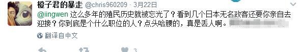 網(wǎng)友@橙子君的暴走也表示:這么多年的殖民歷史就被忘光了?看到幾個(gè)日本無名政客還要你親自去迎接?你到底是個(gè)什么職位的人?點(diǎn)頭哈腰的,真是丟人啊。
