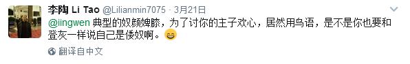 網(wǎng)友李陶 Li Tao?:典型的奴顏婢膝,為了討你的主子歡心,居然用鳥語,是不是你也要和登灰一樣說自己是倭奴啊。