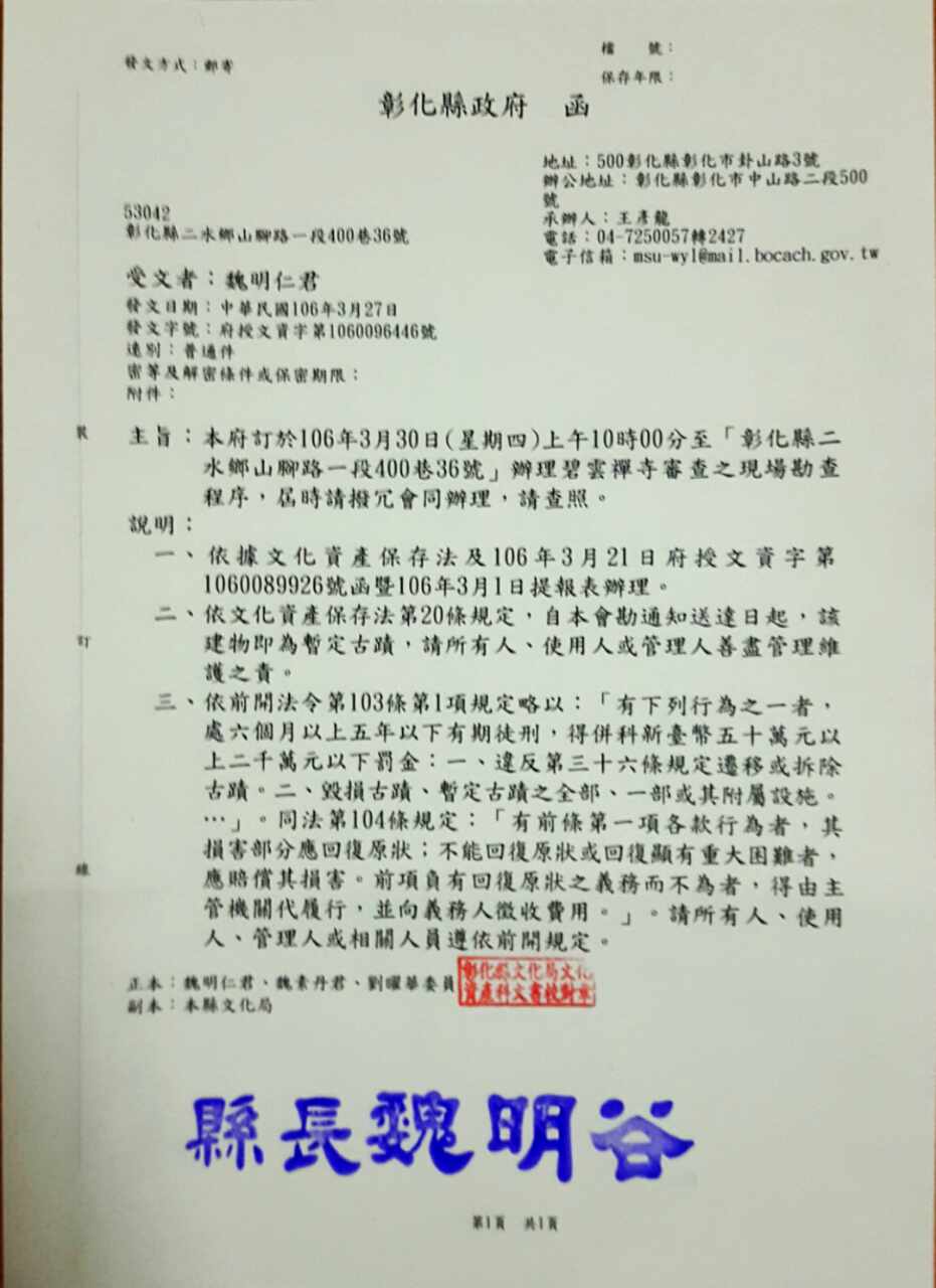 據(jù)親綠的“自由電子報”報道,3月30日,彰化縣政府文化局和建設處到場勘查,遭到愛國基地人員的阻攔,雙方起了沖突,F(xiàn)場雖有警察,但未有強勢作為,結(jié)果一名寺方人員把一頂棒球帽丟到“文化局長”陳文彬的頭部,繼而發(fā)生拉址。整個勘查最后完成,縣政府準備把后殿的舊碧云禪寺列為“暫定古跡”。而前殿新蓋的部分,疑似沒有執(zhí)照,屬于違章建筑,要求自行拆除。
