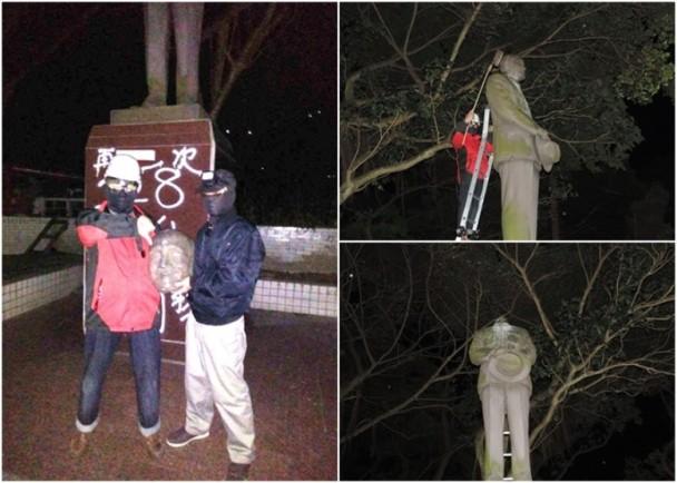“臺獨”團體“臺灣建國工程隊”因不滿臺北市長柯文哲早前在馬來西亞演講時,表示反對目前的“去蔣化”行動,遂于3日凌晨再次發(fā)起“斬首蔣介石行動”,把位于臺北信義區(qū)福德街、柯文哲辦公室附近一個蔣介石銅像的頭斬下來,以表達對柯文哲的不滿。