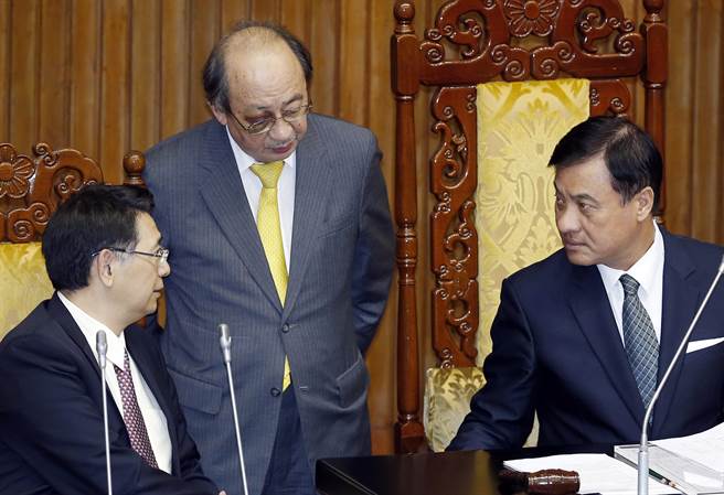 民進黨“立法院”黨團總召柯建銘(中)11日未出席朝野黨團協(xié)商,但出現(xiàn)在議場內(nèi)站在院長蘇嘉全(右)旁邊時,右眼是瘀青的。(圖片來源:臺灣“中時電子報”)