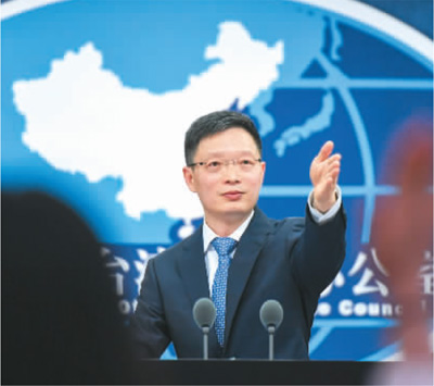 國臺辦發(fā)言人安峰山在發(fā)布會上邀請記者提問。新華社記者 陳曄華攝