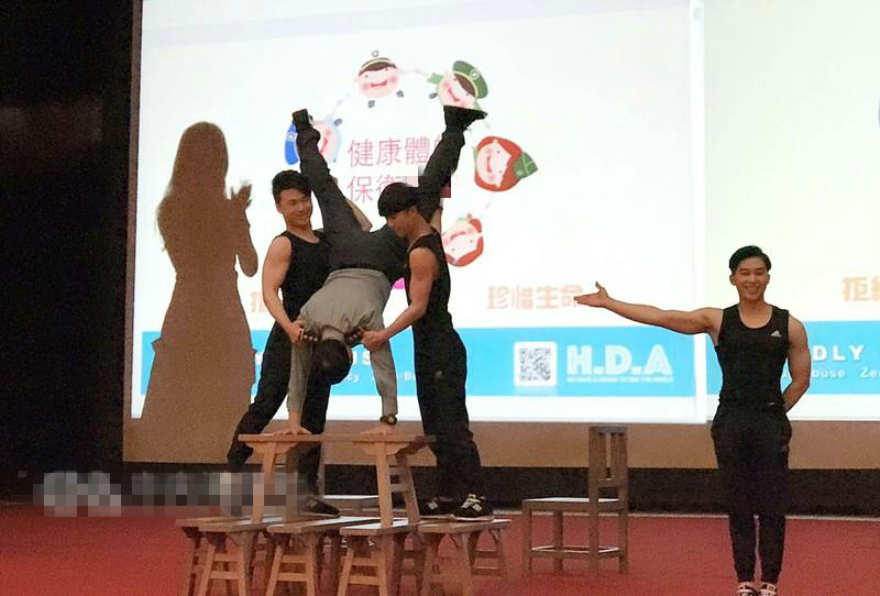 會中并邀請崇右技術(shù)學(xué)院“撼動H.D.A”特技藝術(shù)劇團,以多元活潑的宣教方式,鼓勵官兵堅定夢想,堅決向毒品說“不”。過程中,“撼動H.D.A”團長許鈺祥在團員協(xié)助下,將木椅堆棧至兩層樓高度,于最高點表演倒立后,并坐在最高處與官兵合唱“我的未來不是夢”。62歲的鄭德美更上臺和“撼動H.D.A”一起演出,由團員扶著進行倒立,希望借由活潑的宣教方式傳達反毒理念,令官兵留下深刻印象。