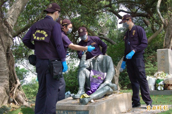 臺(tái)當(dāng)局忙派人對(duì)被斬首的八田與一銅像取證(圖片來源:《自由時(shí)報(bào)》)