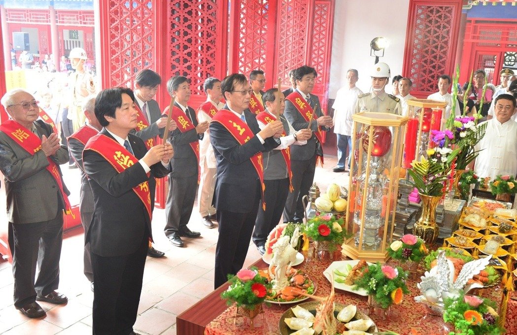 每年,臺(tái)南延平郡王祠都會(huì)舉辦鄭成功祭典,圖為2016年祭典由當(dāng)時(shí)的臺(tái)“內(nèi)政部長”陳威仁(前排左二)及臺(tái)南市長賴清德(前排左)主祭。(圖片來源:臺(tái)“聯(lián)合報(bào)”)