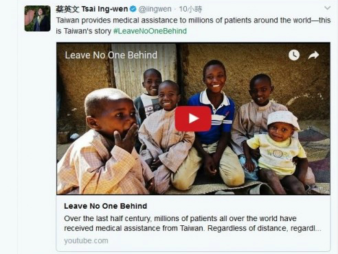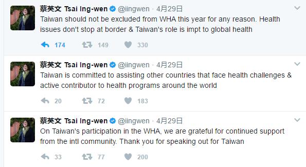 為讓臺灣參加WHA,蔡英文2日再度發(fā)推特。(圖片來源:臺媒)