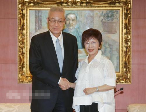 國民黨主席當(dāng)選人、前臺灣地區(qū)副領(lǐng)導(dǎo)人吳敦義(左)23日至國民黨中央黨部,拜訪現(xiàn)任國民黨主席洪秀柱(右),雙方握手致意。圖片來源:臺灣“中央社”