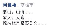 有臺灣網(wǎng)友表示,“民進黨不倒,臺灣不會好!靠你?靠妖啦!”、“蔡明明就是砍殺軍人的頭號殺手,居然說是最大靠山,臉都不會紅嗎?”還有網(wǎng)友諷刺,“靠山,山倒……”、“笑到今晚都睡不著了”。(綜編/海外網(wǎng) 李萌)
