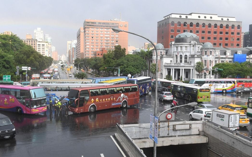 抗議的多輛游覽車擠在路口,一旁有拖吊車等待,不過(guò)游覽車的數(shù)量仍遠(yuǎn)多于拖吊車。(圖片來(lái)源:臺(tái)媒)