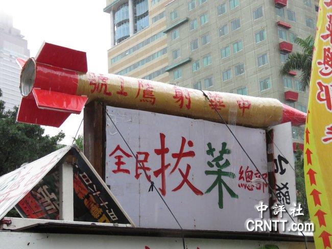 由臺灣“公務(wù)人員協(xié)會”號召的反年改抗議,15日再度在“立法院”周邊登場,雖然整個下午都大雨不停,但澆不熄退休軍公教人員的怒火。其中,一輛名為“全民拔菜總部”的宣傳車上,更架有“中華獵鷹一號”飛彈,非常吸睛,讓許多抗議民眾紛紛合照留念。