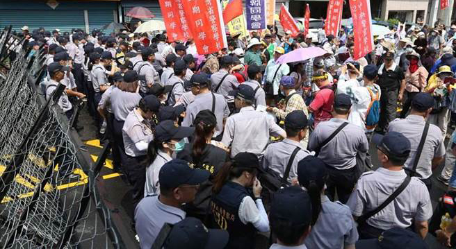 蔡英文6日南下高雄燕巢天后宮參拜,遭到軍公教人士群聚抗議,現(xiàn)場動員大批警察戒備并以層層拒馬隔開抗議群眾。(圖片來源:臺灣“中時(shí)電子報(bào)”)
