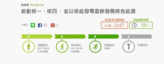 網友提案“啟動核一、核四 ,并以核能發(fā)電盈余發(fā)展綠色能源”,要求有三項重點:重啟核一,啟動核四,啟動核能電廠,解決限電危機,并以核能發(fā)電盈余發(fā)展綠能;上調備載容量;核能決策回歸專業(yè),核電廠運轉審查,“立委”等不具備核能、電力相關科學素養(yǎng),應轉為具備專業(yè)核能知識的人員審查。