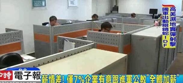 中國臺(tái)灣網(wǎng)9月25日訊 據(jù)臺(tái)灣“中時(shí)電子報(bào)”報(bào)道,臺(tái)灣軍公教明年加薪3%,同時(shí)也希望能帶動(dòng)臺(tái)灣地區(qū)企業(yè)跟進(jìn)。根據(jù)臺(tái)灣人力銀行調(diào)查發(fā)現(xiàn),有意愿在今年第四季幫員工加薪的企業(yè)只有7%,有五成上班族表示,有超過3年沒加薪。