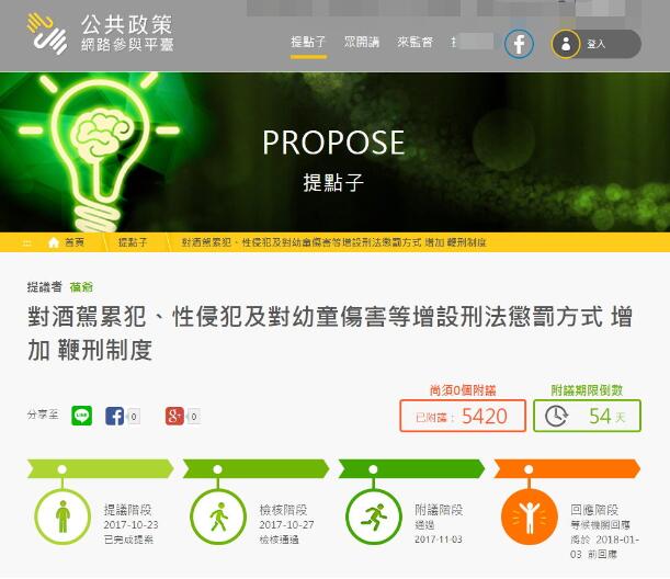 中國(guó)臺(tái)灣網(wǎng)11月3日訊 據(jù)臺(tái)灣《中時(shí)電子報(bào)》報(bào)道,近年來(lái),臺(tái)灣的性侵事件防不勝防,有網(wǎng)友在上月23日針對(duì)性侵、酒駕及幼童傷害,擬增設(shè)“鞭刑制度”,并在“公共政策網(wǎng)絡(luò)參與平臺(tái)”提案,目前已有5000人附議通過(guò),相關(guān)機(jī)構(gòu)須在明年1月3日前響應(yīng)。