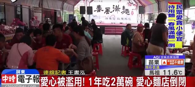據(jù)報(bào)道,屏東市里長林群雄與親友集資250萬元(新臺(tái)幣,下同),于去年11月底開設(shè)“春風(fēng)滿面”,一碗面賣50元,若有弱勢人士需食則不收取費(fèi)用,意在為貧困弱勢提供一餐溫飽,卻不料如此愛心竟被民眾濫用,比如有人天天上面館食用不付錢,還有人要求打包回家,店家不同意的話就在現(xiàn)場起爭執(zhí)。
