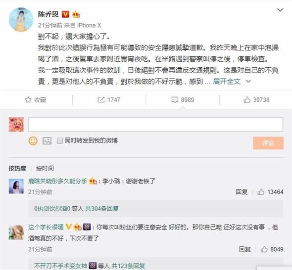 “對不起,讓大家擔(dān)心了。我對于此次錯(cuò)誤行為極有可能導(dǎo)致的安全隱患誠摯道歉。我昨天晚上在家中泡澡喝了酒,之后駕車去家附近買宵夜吃。在半路遇到警察叫停之后,停車檢查。