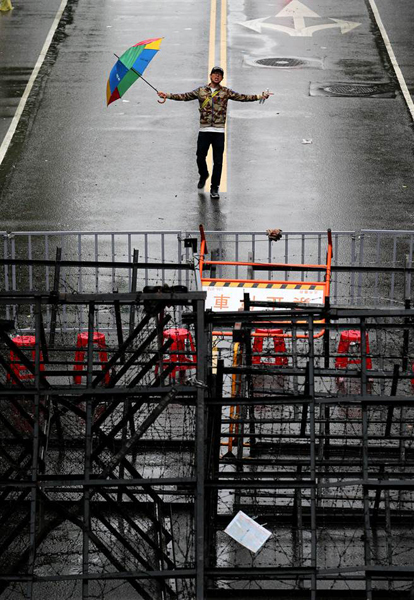 臺(tái)灣“立法院”8日召開臨時(shí)會(huì)處理“勞基法”修正案,1名男子站在拒馬前高聲表達(dá)訴求。(圖片來源:臺(tái)灣“中國時(shí)報(bào)”)