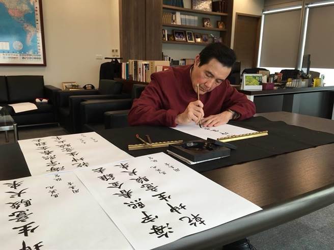 馬英九揮毫,親筆寫狗年春聯(lián)。(圖片來源:臺灣《中時電子報》)