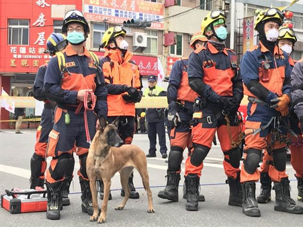 特搜人員與搜救犬進(jìn)駐翠堤大樓現(xiàn)場。(圖片來源:臺灣“中時(shí)電子報(bào)”)