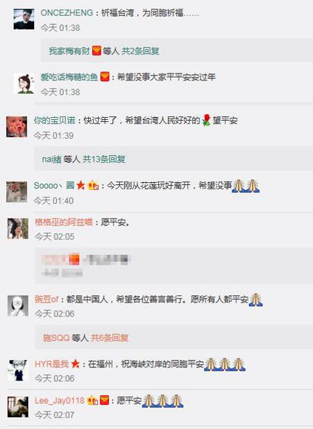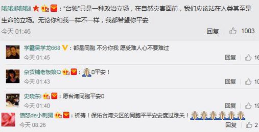 此外,在眾多的祈福帖中,還有一種令人無法忽視的溫暖聲音,那就是“同胞之情”。當(dāng)如今的臺灣被“臺獨(dú)”勢力染指時(shí)、當(dāng)一小部分臺灣民眾被蔡英文當(dāng)局所謂的“臺灣價(jià)值”洗腦時(shí),大陸網(wǎng)友則是在大災(zāi)面前溫情喊話:臺灣與大陸是同胞,希望同胞平安!