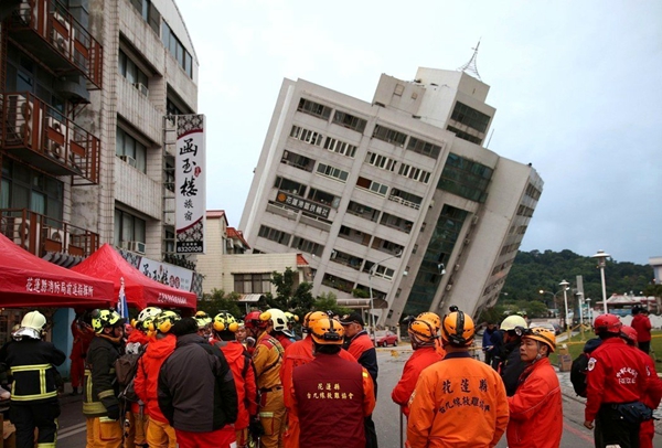 2月6日花蓮強震,花蓮市商校街的云翠大樓嚴重傾斜,隨時有倒塌可能,目前警消仍在搶救中。(圖片來源:臺灣《聯(lián)合報》)
