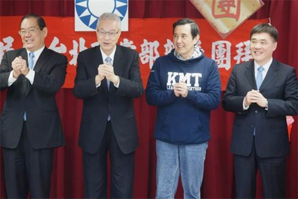 國民黨臺北市黨部22日舉辦新春團(tuán)拜,國民黨副主席郝龍斌(右起)、前臺灣地區(qū)領(lǐng)導(dǎo)人馬英九、國民黨主席吳敦義、國民黨秘書長曾永權(quán)拱手做揖拜晚年。(圖片來源:臺灣《中時電子報》)