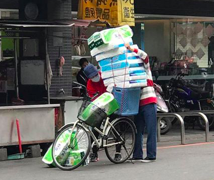 網(wǎng)友近日上傳《爆廢公社》一張搬運衛(wèi)生紙的離奇照片,笑道“最近大家都在表演衛(wèi)生紙?zhí)丶肌,讓人拍案叫絕。照片中可看到一對年紀已有一把的阿伯、伯母正想方設(shè)法把買來的十串衛(wèi)生紙固定在腳踏車后座上,還出動了洗衣籃和繩索等道具,有點荒誕又有點心酸,大家都很好奇他們到底能不能順利把衛(wèi)生紙搬回家。