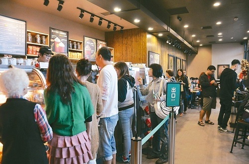 春節(jié)后多家連鎖餐廳、手搖飲料店宣布漲價(jià)。圖為高鐵苗栗站星巴克門市吸引民眾排隊(duì)。(圖片來源:臺(tái)灣《聯(lián)合報(bào)》)