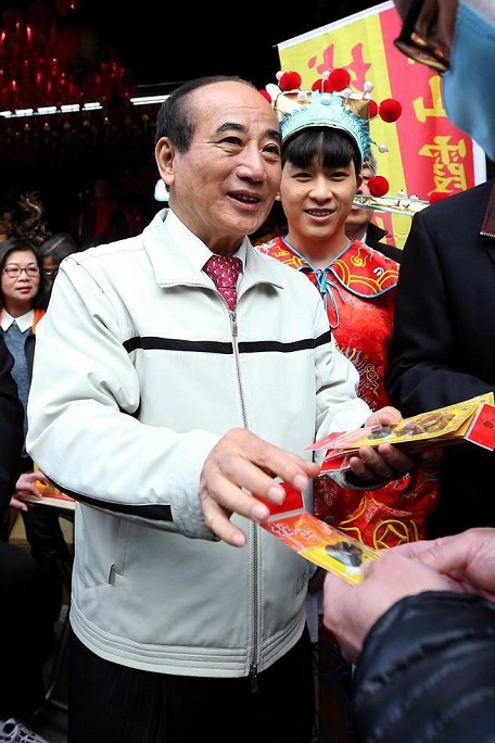 圖為臺灣前“立法院長”王金平(中)春節(jié)期間出席松山霞海城隍廟開工迎財神活動。(圖片來源:臺灣“中時電子報”)