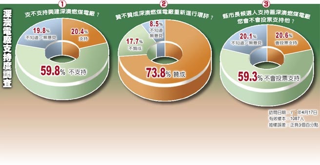 據(jù)旺旺中時民調(diào)顯示,65.3%的北北基民眾知道新北市瑞芳地區(qū)即將興建深澳電廠,73.8%贊成“重做環(huán)評”,只有17.7%反對。經(jīng)過交叉比對,不分藍綠政黨傾向,贊成深澳電廠重做環(huán)評比率都超過7成,其中,80.9%泛綠選民支持重新環(huán)評,比泛藍選民的75.1%,還高出近6個百分點。至于環(huán)保團體要求改成“污染較少的天然氣發(fā)電”,60.8%民眾接受,26%不接受,13%左右沒意見。