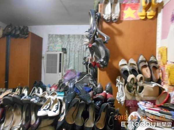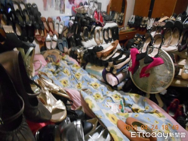 陳姓男子小小的房間堆滿盜竊來的且為受害人穿過的女鞋。(圖片來源:臺灣“東森新聞云”)