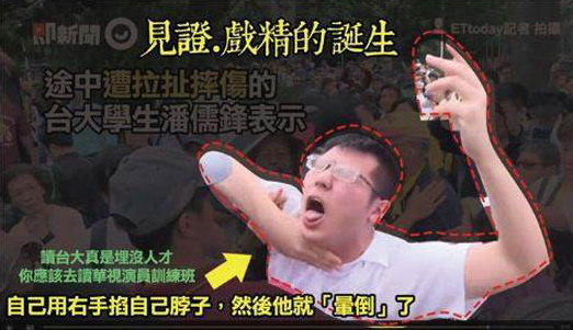 中國臺灣網(wǎng)5月5日訊 為反對蔡英文當局違法亂政,強行拔出“顏色不對”的管中閔當選校長資格,臺大自主聯(lián)盟4日發(fā)起“新五四運動”,校內(nèi)“挺管”、“反管”的力量也爆發(fā)沖突。臺灣“中時電子報”報道,“反管”陣營的臺大資管系學生潘儒鋒聲稱,沖突中,他被人從后拉扯勒住以致摔倒。不過,隨后曝光的沖突影片卻顯示,其是自己用手掐脖子而后倒地,進而被網(wǎng)友群起遭諷!澳氵@么好騙,你家里人知道嗎?”Facebook粉絲頁發(fā)圖笑說:見證戲精誕生!自己用手掐脖子、自己倒地,謝謝潘同學為我們帶來這么有創(chuàng)意的表演,來賓請給分。