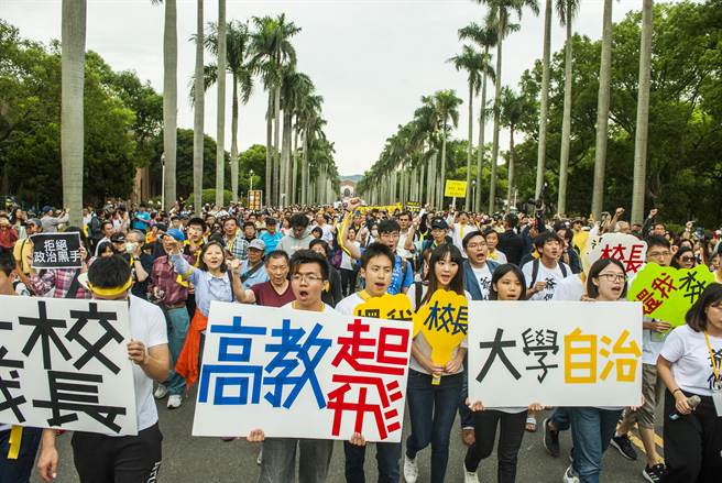 臺(tái)大師生4日在校園發(fā)起“新五四運(yùn)動(dòng)”,現(xiàn)場(chǎng)涌入數(shù)千名學(xué)生校友及聲援人士,高喊“大學(xué)自治、還我校長”等口號(hào)。(圖片來源:臺(tái)灣《中時(shí)電子報(bào)》)