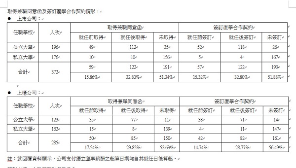 陳學圣表示,針對大專院校專任教師擔任上市柜公司獨立董事,是否取得兼職同意函及簽訂產(chǎn)學合作契約,“金管會”先前委托證交所、柜買中心,采問卷方式調(diào)查。根據(jù)調(diào)查,上市公司有聘任具大專院校專任教師身份之獨立董事,共372人次,其中32.80%于就任后取得兼職同意函,而高達51.34%則未取得;于就任后簽訂產(chǎn)學合作契約者占32.80%,未簽訂者也高達51.88%。另外,于上柜公司兼任獨立董事之具大專院校專任教師身份者有285位,其中29.82%于就任后取得兼職同意函,高達52.63%未取得;就任后簽訂產(chǎn)學合作契約者占28.77%,未簽訂者達56.49%。
