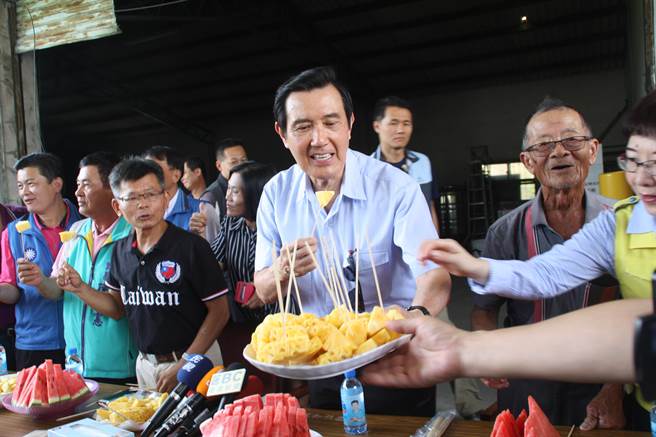 馬英九請?jiān)趫鋈耸科穱L菠蘿,化身為大樹區(qū)菠蘿最佳代言人。(圖片來源:臺灣“中時電子報(bào)”)