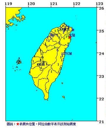 臺灣氣象主管部門指出,各地最大震度為宜蘭縣牛斗4級,宜蘭市3級,新北市3級,臺北市3級,桃園市3級。