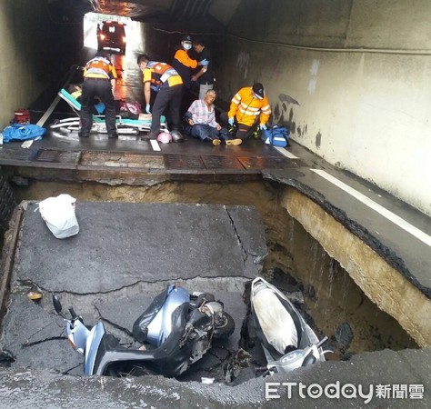 臺(tái)南市連日大雨,19日清晨東區(qū)林森路地下機(jī)車道發(fā)生坍方塌陷,有3名騎士行經(jīng)該處人車跌落受傷送醫(yī)。(圖片來(lái)源:臺(tái)灣“東森新聞云”)