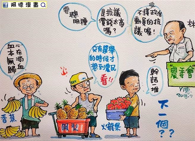 報道說,繼菠蘿、香蕉價格崩盤后,先前也傳出火龍果跌價,雖然臺灣地區(qū)農(nóng)政機關(guān)疲于奔命四處滅火,但表現(xiàn)讓臺灣地區(qū)領(lǐng)導人、“行政院長”、民眾、農(nóng)民都不滿意。對此,粉!鞍⒌侣嫛碑嫵龀爸S創(chuàng)作,圖中的“農(nóng)委會主委”林聰賢指著果農(nóng)說教,表示“要聰明種”“是抗議價錢太高?”“不接受政治動員的抗議喔”。而果農(nóng)們也紛紛表達不滿,香蕉農(nóng)說“血本無歸,心在淌血”、菠蘿農(nóng)說“只有選舉的時候,才想到農(nóng)民,看!”火龍果農(nóng)無奈表示“干話一堆”。