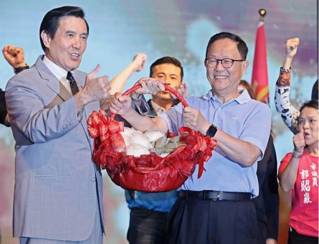 馬英九(左)25日在國民黨臺北市長參選人丁守中(右)等人陪同下,出席臺北市工商婦女會挺丁守中后援會成立大會,馬并致贈象征好兆頭的包子、粽子給丁,祝他高票當選。(圖片來源:臺灣《中時電子報》)