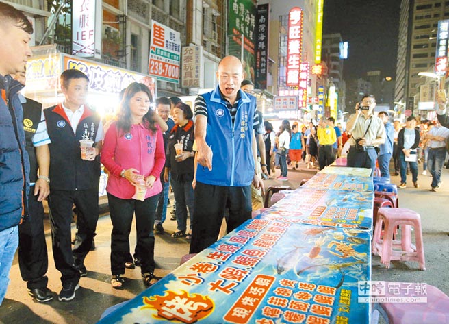 韓國瑜5月間曾和黨內(nèi)議員拜訪高雄六合夜市攤商,往昔摩肩接踵的盛況已不復(fù)見,許多攤位桌椅空蕩沒生意。(圖片來源:臺灣《中時電子報》)
