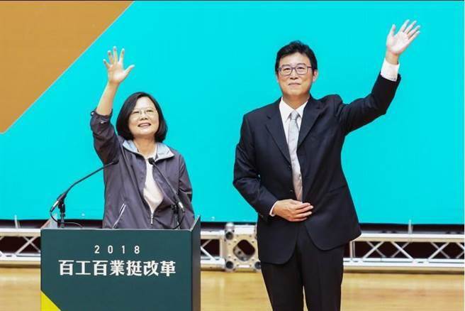 民進(jìn)黨3日主辦“百工百業(yè)挺改革大會(huì)–臺(tái)北場(chǎng)”,蔡英文(左)為選情一直低迷的姚文智(右)加油打氣。(圖片來源:臺(tái)灣“中時(shí)電子報(bào)”)
