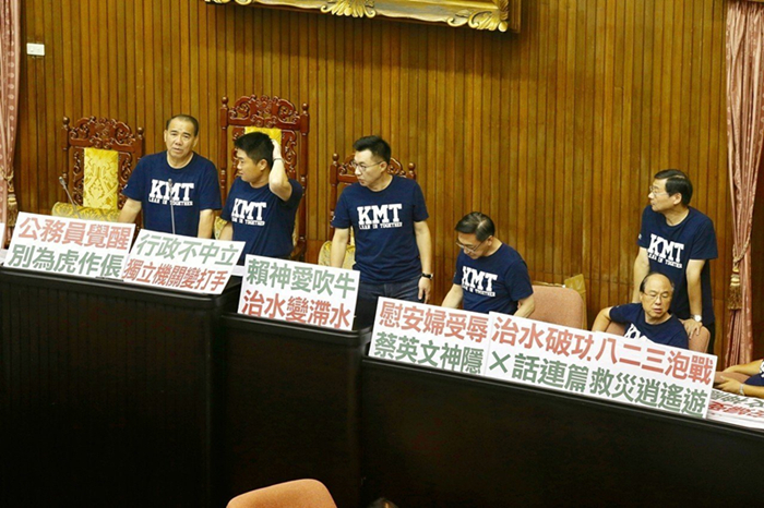 國民黨“立委”在現(xiàn)場擺滿抗議標(biāo)語,包含“公務(wù)員覺醒、別為虎作倀”“慰安婦受辱、蔡英文神隱”“賴神愛吹牛、治水變滯水”“行政不中立、獨(dú)立機(jī)關(guān)變打手”“賴清德綁樁、政策買票7400億”“假新聞?wù)妾?dú)裁、箝制新聞自由”;還在地面鋪上“東廠亂政、民主之恥”“促轉(zhuǎn)惡轉(zhuǎn)、賴揆道歉”大字。隨后一行人邊開會(huì)邊占領(lǐng)主席臺(tái)。